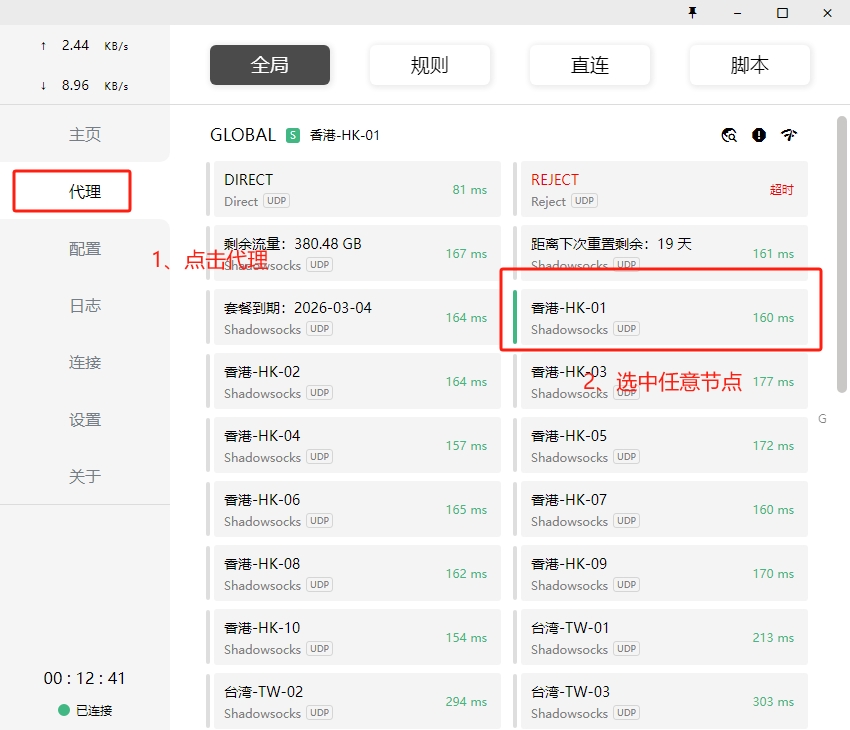 4:去到”代理“选项,选择全局代理模式然后手动选择一个节点,你也可以系统自动选择节点,并且对节点进行一次测速,每个节点后面都出现了绿色数字,代表节点激活成功,如下图右上角小红框就是节点测速按钮,如